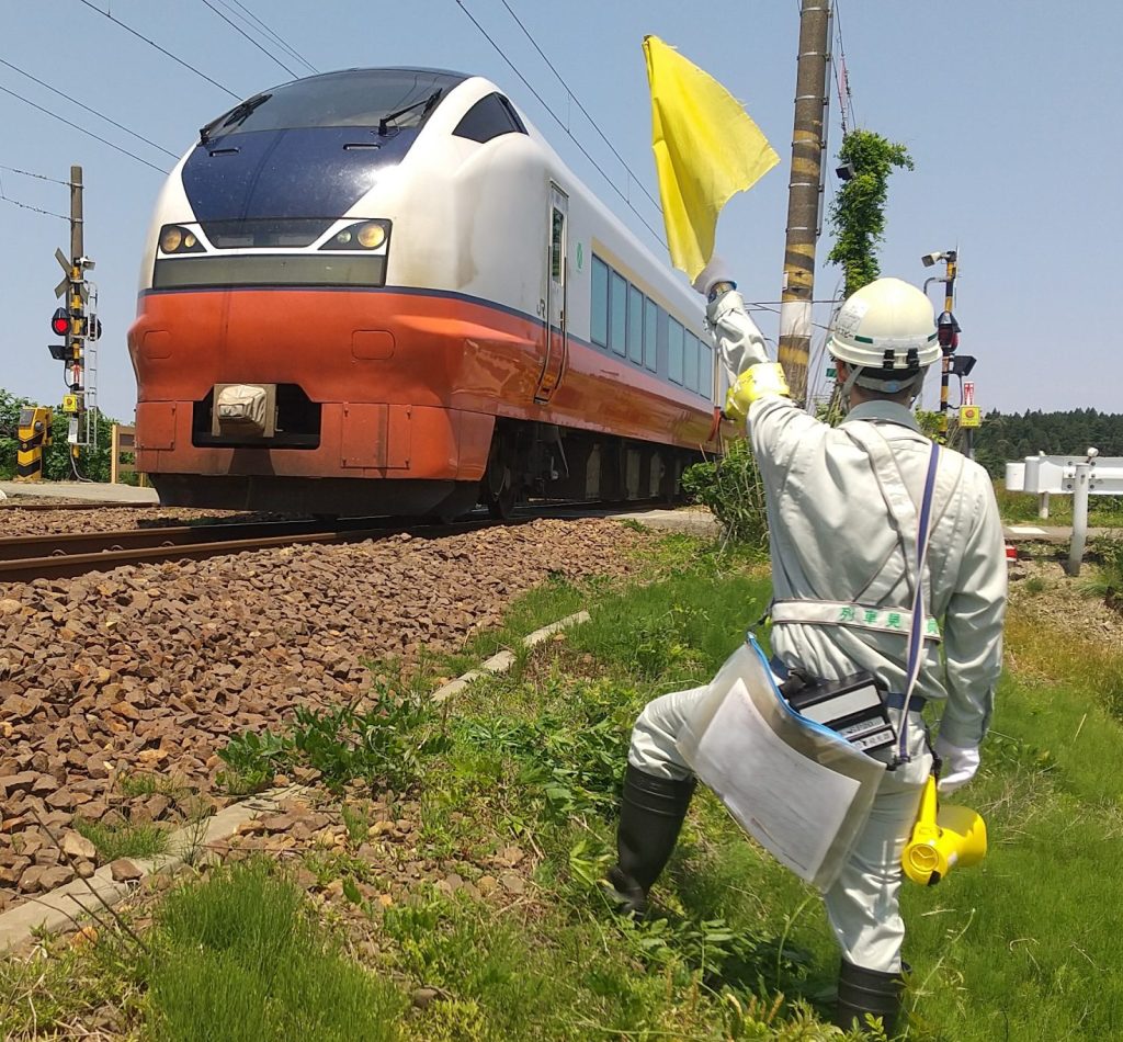 線路に近接する工事現場において列車の正常な運行、及び工事従事者の安全を守る業務です。